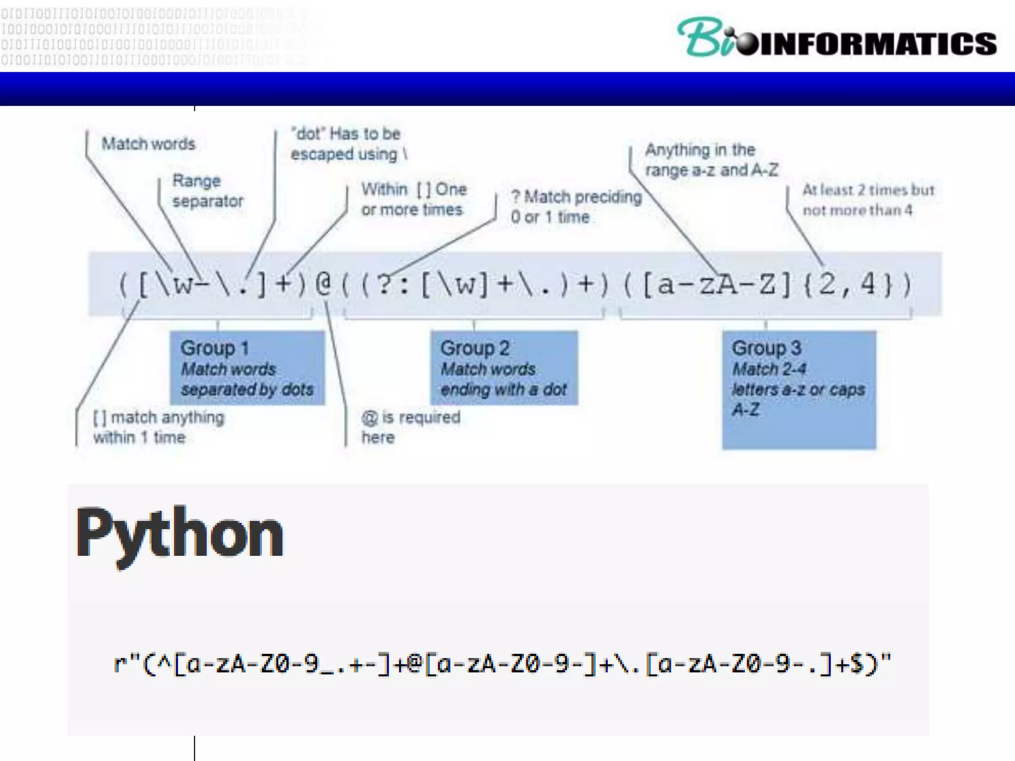 The document discusses regular expressions (regex) in Python. It provides examples of using regex to search for patterns in strings, extract matches, and find and group substrings. Key concepts covered include regex syntax like anchors, character classes, repetition, capturing groups, greedy/non-greedy matching, and the re module's functions like search, findall, finditer, and sub. Real-world applications mentioned include validating formats like IP addresses and parsing structured data.