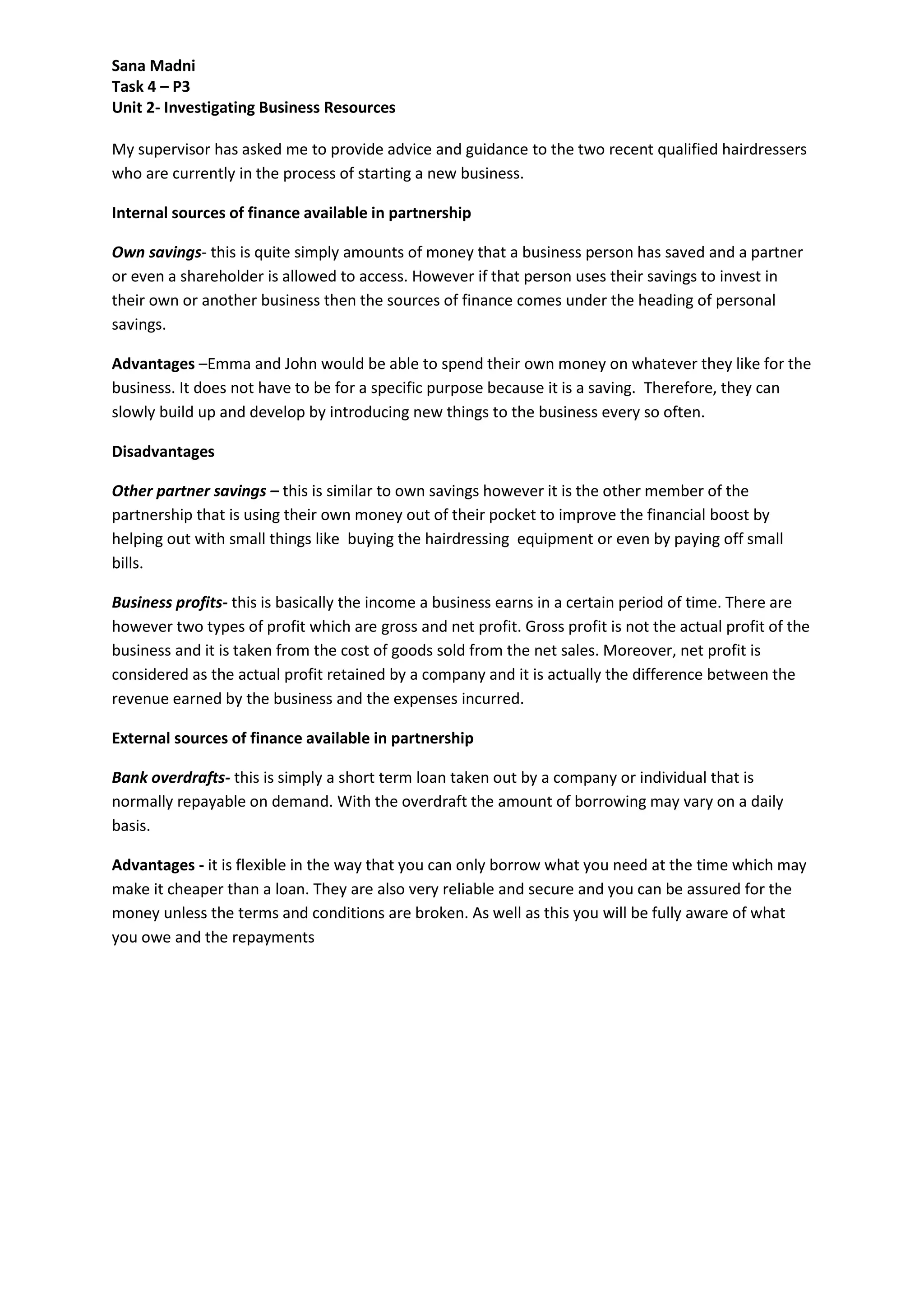 The document provides advice for two new hairdressers starting a business on internal and external sources of finance available as business partners. Internal sources include using their own savings which provides flexibility but is limited in amount, or using one partner's savings which helps financially but relies on that partner. Business profits can also be used, with the distinction that gross profits are not actual profits while net profits are actual retained earnings after expenses. External sources include bank overdrafts which provide flexibility in borrowing only what is needed and are reliable as long as terms are met.