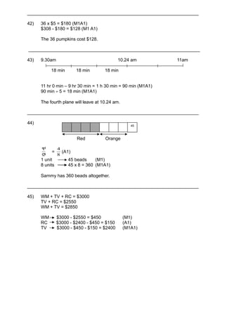 The document models concise responses to math word problems at a primary school level, showing the steps and calculations to arrive at the final answers.