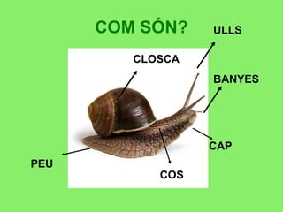 Snails have a shell, eyes, head, foot and horns. Their shells come in different colors. They live in forests and grasslands among leaves and foliage, eating plants, leaves and moss. They drink water from leaves. Snails reproduce and there are land and sea varieties. Links are provided to a story and song about snails.