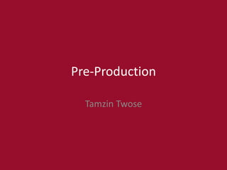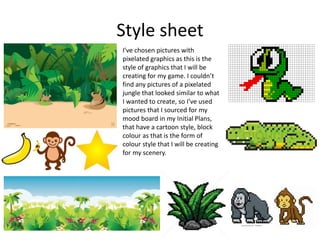 The document discusses Tamzin Twose's pre-production plans for a pixelated jungle-themed game. It includes style sheets for graphics and fonts, color schemes, layout mockups, and a schedule for creating gameplay assets over 8 days in Adobe Photoshop. Contingency plans are also outlined to avoid issues with scale, layers, software/hardware failures, and health and safety concerns during the design process.
