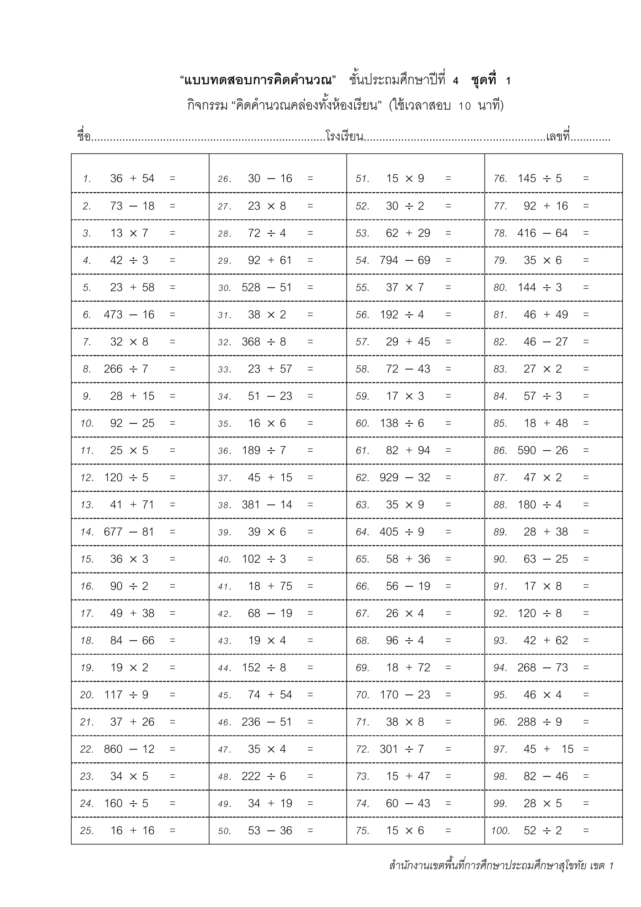 The document appears to be a math worksheet for 4th grade students in Thailand. It contains 100 math word problems testing addition, subtraction, multiplication and division skills. Students are asked to solve the problems within a 10 minute time limit. The worksheet is identified as being from the Sukhothai Educational District Office, and is the third of four similar worksheets for practice and assessment.