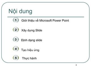 Tài liệu giới thiệu về Microsoft PowerPoint, nhấn mạnh đây là công cụ hỗ trợ giảng dạy và thuyết trình hiệu quả. Nó cung cấp các tính năng như tạo hiệu ứng, định dạng slide và quản lý nội dung đơn giản giống như Microsoft Word. Các bước cơ bản để khởi động, tạo và định dạng slide được trình bày chi tiết trong tài liệu.