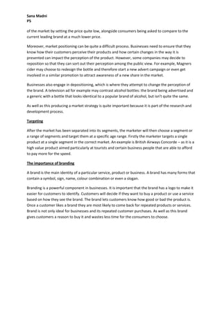 The document discusses various marketing techniques used by organizations, including market segmentation, targeting, positioning, and branding. It provides details on how Magners Cider uses these techniques. Specifically, it notes that Magners segments its market by age range, targeting 20-25 year olds. It uses branding to increase recognition and promotions both above and below the line. The location where it places its products is also important to effectively target its desired demographic.