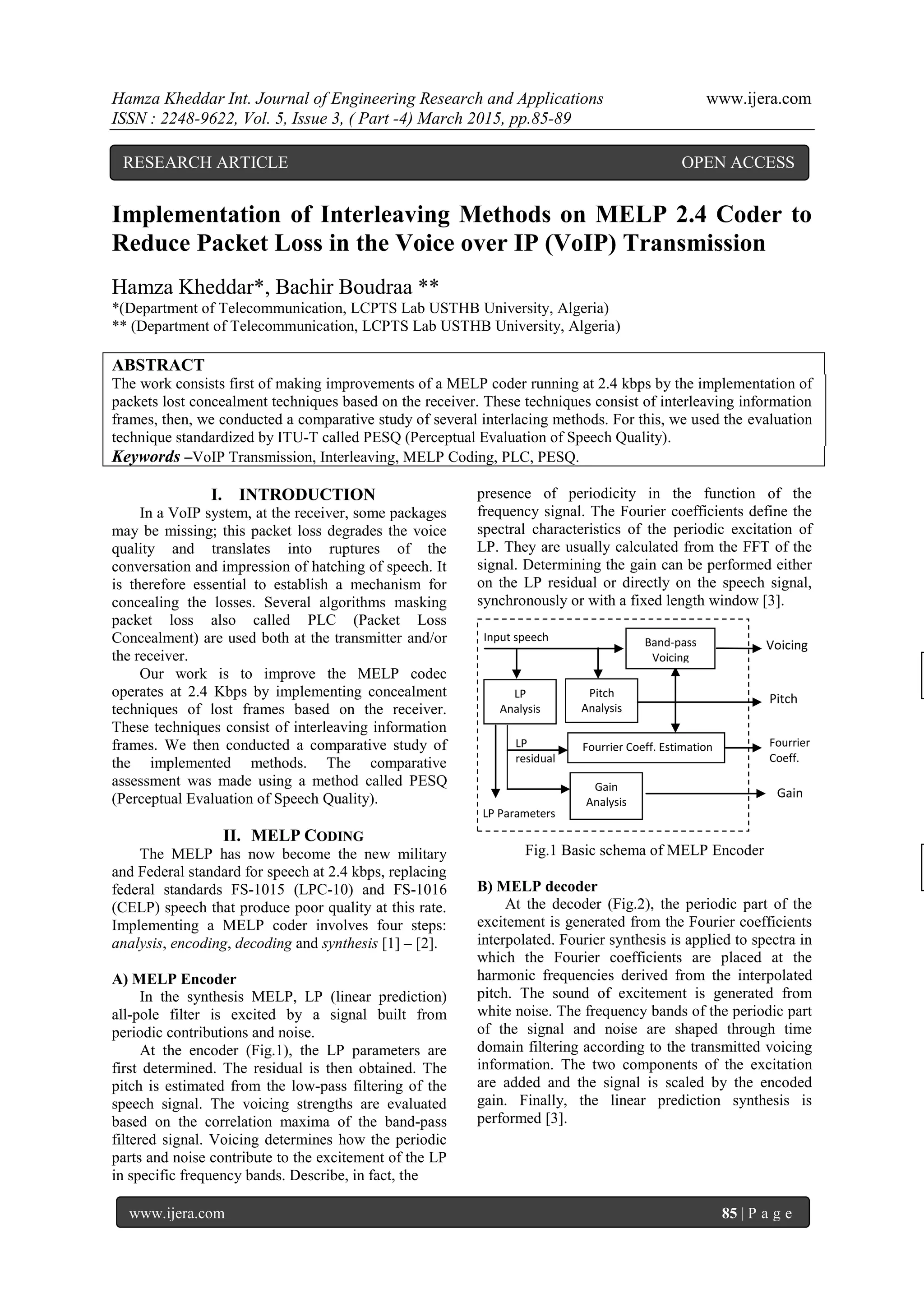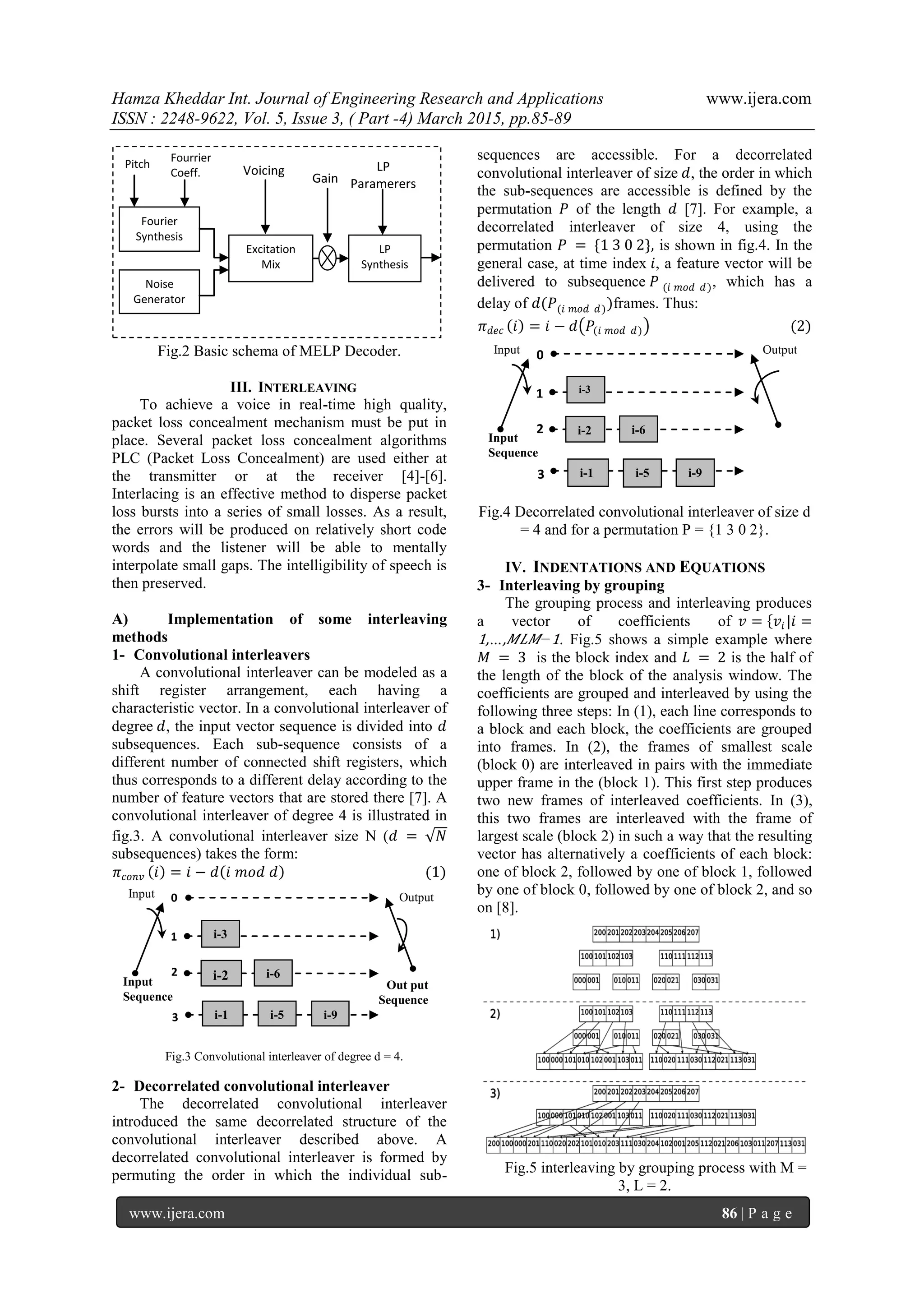 The document discusses methods to reduce packet loss in Voice over IP (VoIP) transmission using interleaving techniques on a MELP coder operating at 2.4 kbps. Various interleaving approaches were implemented and compared using the Perceptual Evaluation of Speech Quality (PESQ) technique, highlighting that the decorrelated convolution interleaver yielded the best improvements in voice quality for higher packet loss rates. The study concludes that while interleaving can enhance perceptual quality significantly at loss rates above 12%, its effectiveness diminishes near lower loss rates where performance is comparable to that of signals without interleaving.