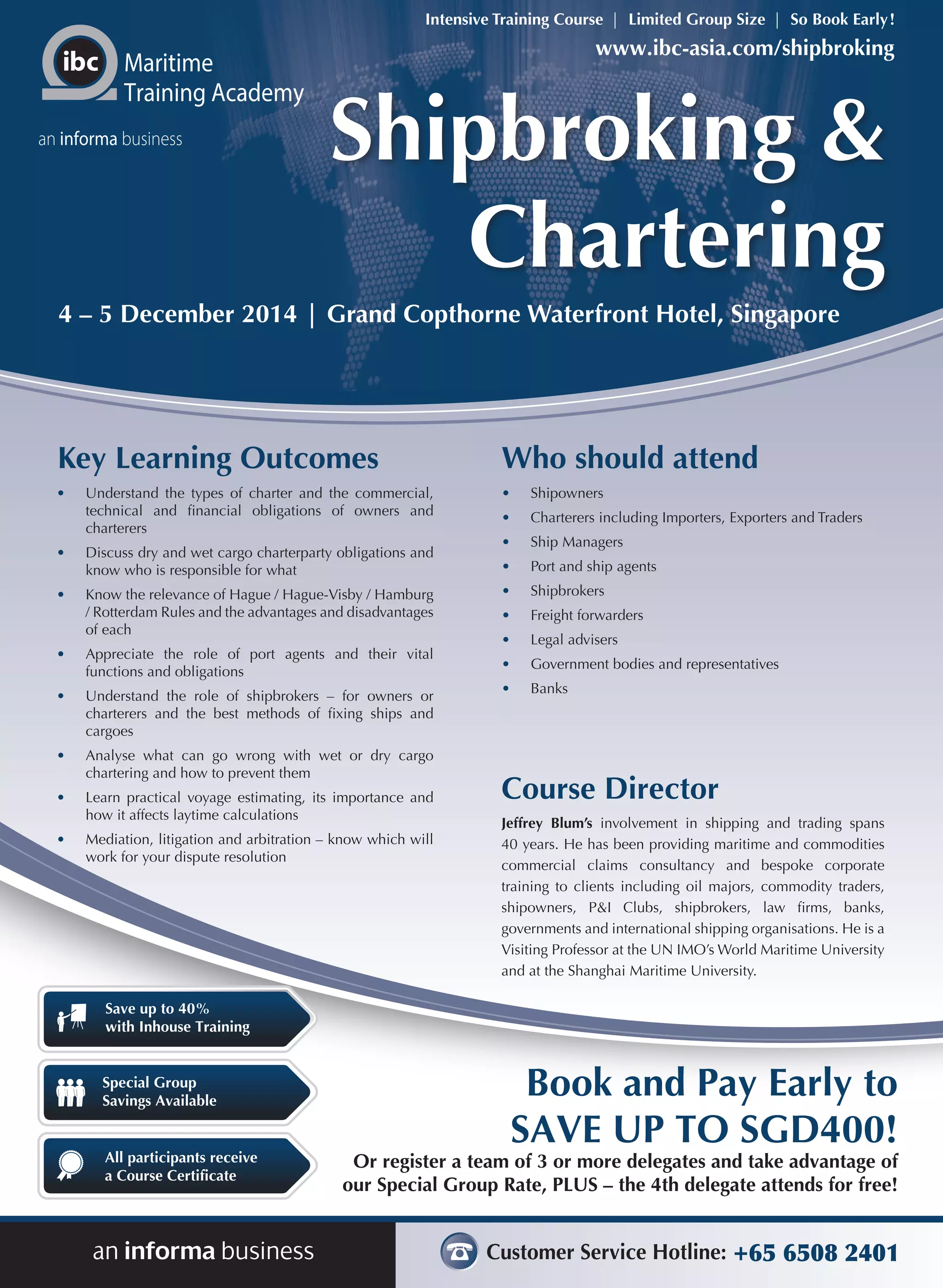 The document details an intensive training course on shipbroking and chartering scheduled for 4-5 December 2014 at the Grand Copthorne Waterfront Hotel in Singapore, highlighting key learning outcomes such as understanding charter obligations and dispute resolution methods. Participants can benefit from early registration discounts and group rates, with training led by expert Jeffrey Blum, who brings extensive industry experience. The course is suitable for a variety of professionals in shipping and logistics, aiming to enhance their understanding of commercial and legal aspects of charter negotiations.