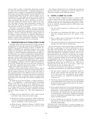 The document proposes a software architecture that uses a Grid computing environment to realize a Content Distribution Network for multimedia content. The architecture exploits Grid resources not only for storage but also for on-the-fly transcoding of multimedia files into formats supported by clients. It describes components that select the nearest storage element to the client and a computing element with sufficient resources to perform transcoding when needed, aiming to minimize latency and maximize quality of service for the user.