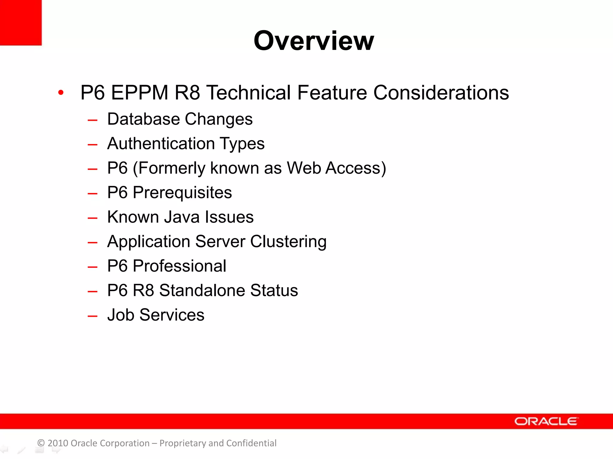 The document provides an overview of the key technical features and considerations for installing and implementing Oracle Primavera P6 Release 8 (P6 R8). It discusses changes to the database, authentication types, P6 web access, prerequisites, known Java issues, application server clustering, the P6 Professional client, standalone status, job services, enterprise reporting, security hardening, technologies added and dropped in R8, installation instructions, documentation resources, and support options.