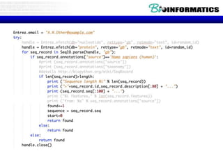 The document discusses various bioinformatics tools and algorithms for analyzing protein sequences, including Biopython for working with biological sequence data, the Kyte-Doolittle algorithm for predicting transmembrane regions, and the Chou-Fasman algorithm for predicting secondary structure from amino acid preferences for alpha helices, beta sheets, and random coils. It also provides examples of analyzing Swiss-Prot data to find properties of human proteins and applying these tools and libraries to extract insights from protein sequences.