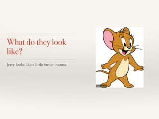 Jerry is a little brown mouse who lives in a hole inside someone's house. He often steals food and tricks Tom the cat, thinking about how to get his next meal. While Jerry doesn't talk, Tom frequently tries to catch and eat him.