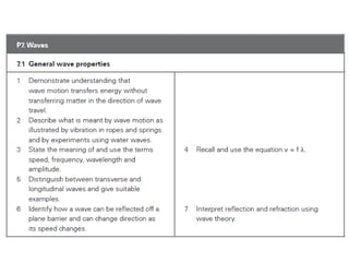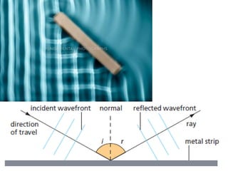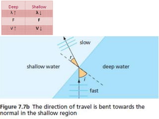 The document discusses various properties of waves including: 1. Progressive waves carry energy from one place to another without transferring matter. Transverse waves have particle disturbance perpendicular to the direction of travel, like water waves. 2. A wavefront is a line where the disturbance is in the same phase, like wave crests. Reflection and refraction occur when waves pass from one medium to another, changing speed and direction. 3. Diffraction is the spreading of waves at obstacles. Wave theory can explain reflection, refraction, and the difference between transverse and longitudinal waves where particles vibrate along or perpendicular to the direction of travel.