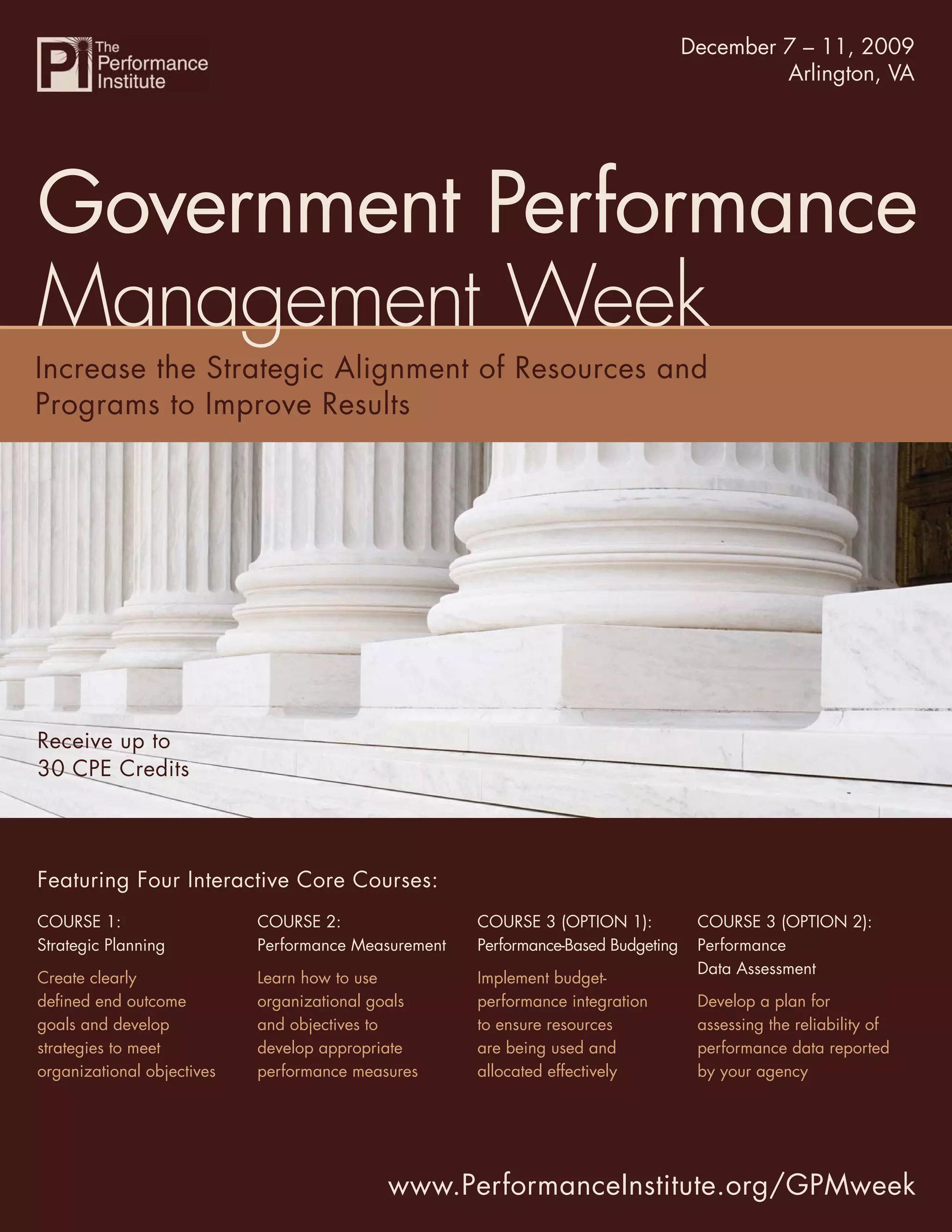 Government Performance Management Week is a four-day training event held in Arlington, Virginia from December 7-11, 2009. Attendees can receive up to 30 CPE credits by taking four interactive core courses on strategic planning, performance measurement, performance-based budgeting, and performance data assessment. The training features expert instructors and is intended for those involved in strategic planning, program management, budgeting, and performance analysis at all levels of government.