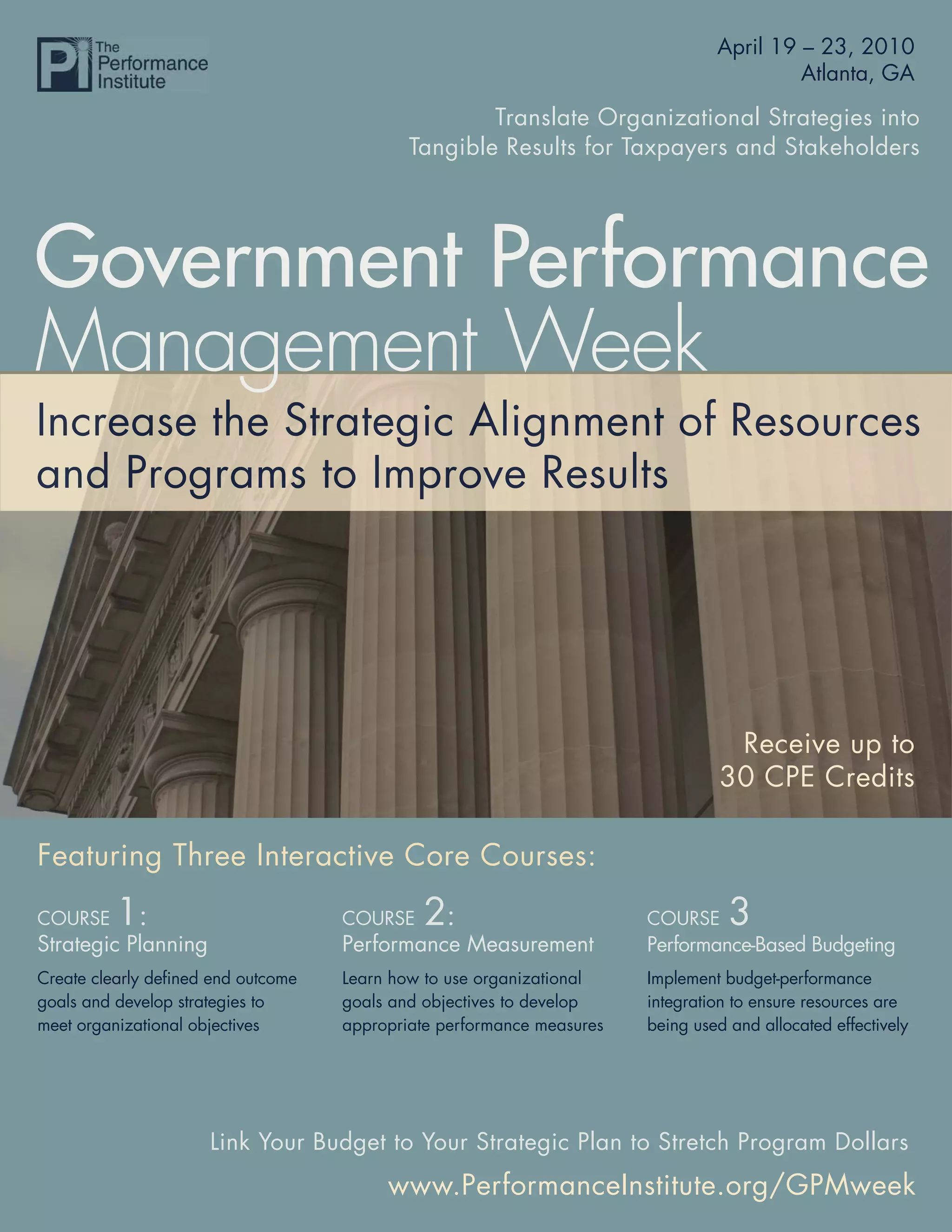 Government Performance Management Week was held from April 19-23, 2010 in Atlanta, GA. The event featured three interactive core courses on strategic planning, performance measurement, and performance-based budgeting. Attendees could receive up to 30 CPE credits. The courses taught strategies and best practices for linking organizational strategies to tangible results for taxpayers through strategic planning, performance measurement, and performance-based budgeting.