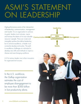 The document summarizes an American Strategic Management Institute leadership series taking place from March 29-31, 2010 in Arlington, VA. The series consists of three courses that focus on refining communication, engaging employees, and using innovation and creativity. Specific topics covered include communicating vision, aligning goals, listening, managing conflict, examining best practices in employee engagement, leading change, and fostering a creative culture. The goal is to provide leaders with tools for motivating teams and driving organizational performance.