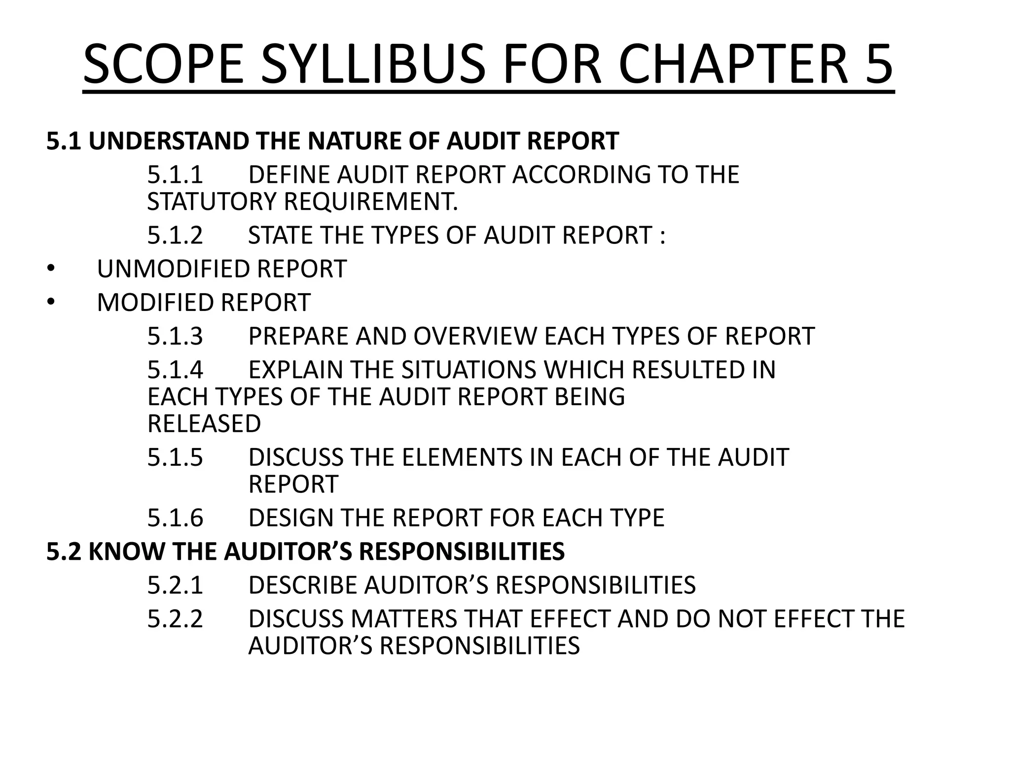 This document outlines the scope and content for Chapter 5 of an audit course. It covers understanding audit reports, the types of reports including unmodified and modified, and the elements and situations that result in each type of report. It also discusses the auditor's responsibilities, including maintaining professional skepticism and ensuring financial statements are free from material misstatement. The types of audits are defined as external, internal, and compliance audits.