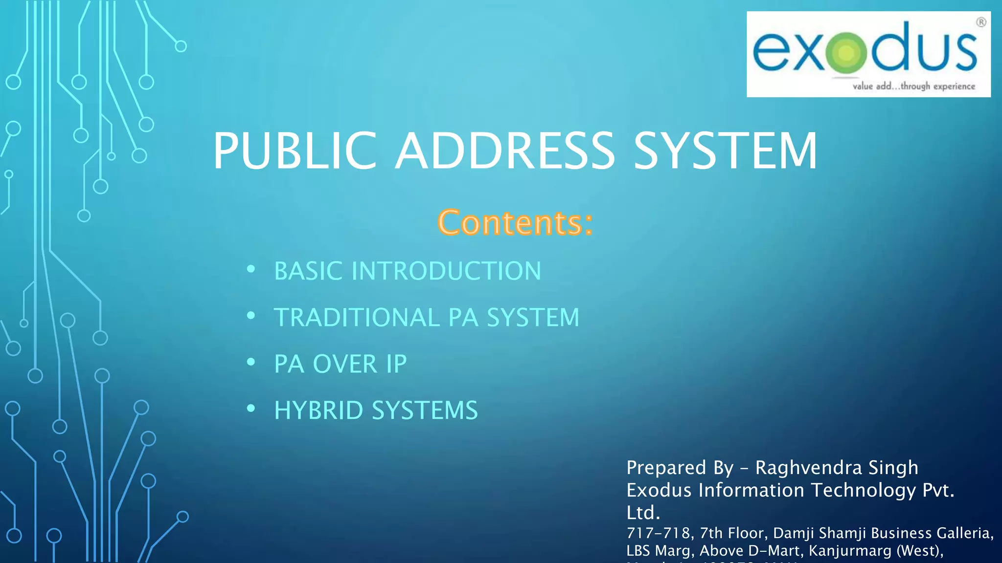 This document discusses different types of public address (PA) systems. A traditional PA system consists of a microphone, zone amplifier, and speakers. PA over IP uses an IP network instead of a centralized amplifier to distribute audio to locations within reach of the network. A hybrid system combines traditional zone amplifiers with a digital logic system, allowing for selective paging while keeping costs lower than a fully digital system. The document provides examples of different PA system setups for venues like schools, hospitals, and metro stations.
