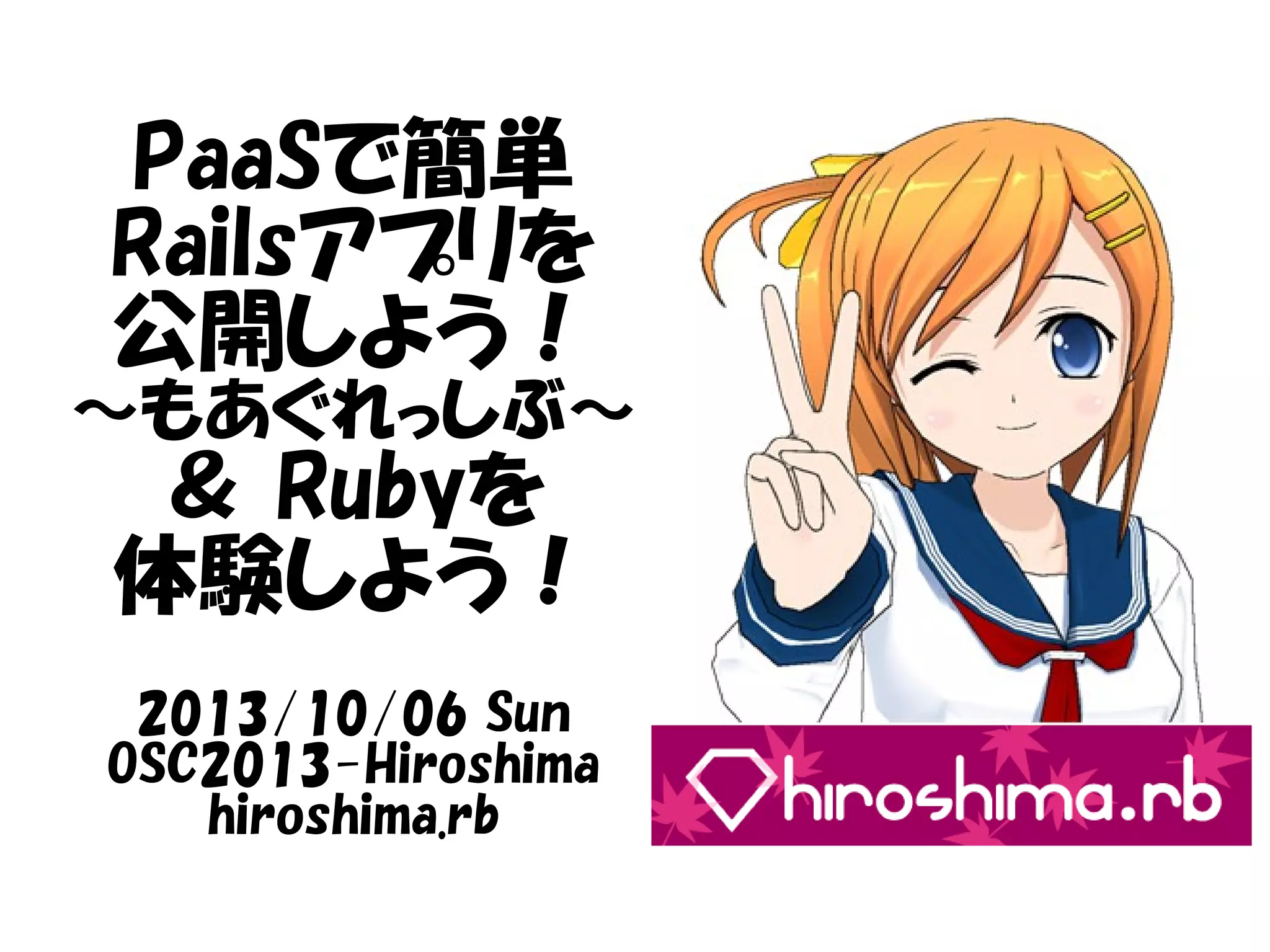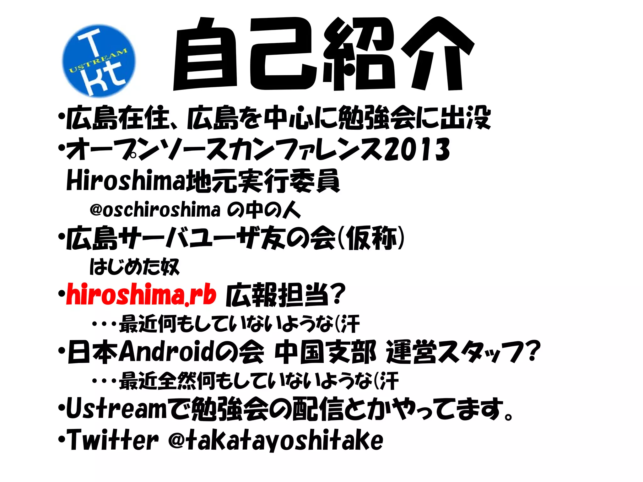 2013-10-06 (日) オープンソースカンファレンス2013 Hiroshima 10時00分 ~ 広島でRubyが流行らないのはどう考えても俺たちが悪い https://www.ospn.jp/osc2013-hiroshima/modules/eguide/event.php?eid=10