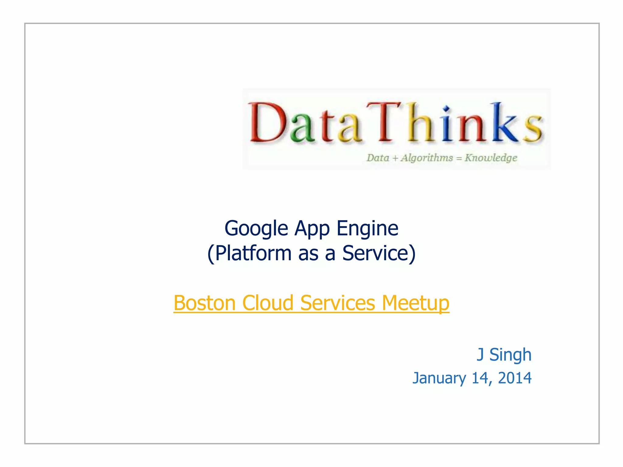 The document discusses Google App Engine, a platform as a service (PaaS) that allows developers to focus on development rather than operations. It presents Google App Engine as having a "virtual raised floor" with the IDE above the floor and website/deployment system below. It provides an overview of Google App Engine's history and supported languages/data stores. It also summarizes code samples for a guestbook application and MapReduce workflow on Google App Engine.
