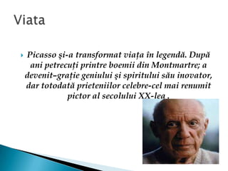 Pablo Picasso, născut în 1881 în Malaga, a devenit cel mai faimos pictor al secolului XX, marcând istoria artei prin inovațiile sale, în special prin cubism, alături de Georges Braque. Cariera sa a evoluat de la perioada albastră, în care a exprimat tristețea și suferința, la perioada roz, plină de optimism și culori vii, inspirată de circ. Opera sa nu doar că a sfidat normele artistice, dar reflectă și evoluția personală a artistului pe parcursul a optzeci de ani de activitate creativă.