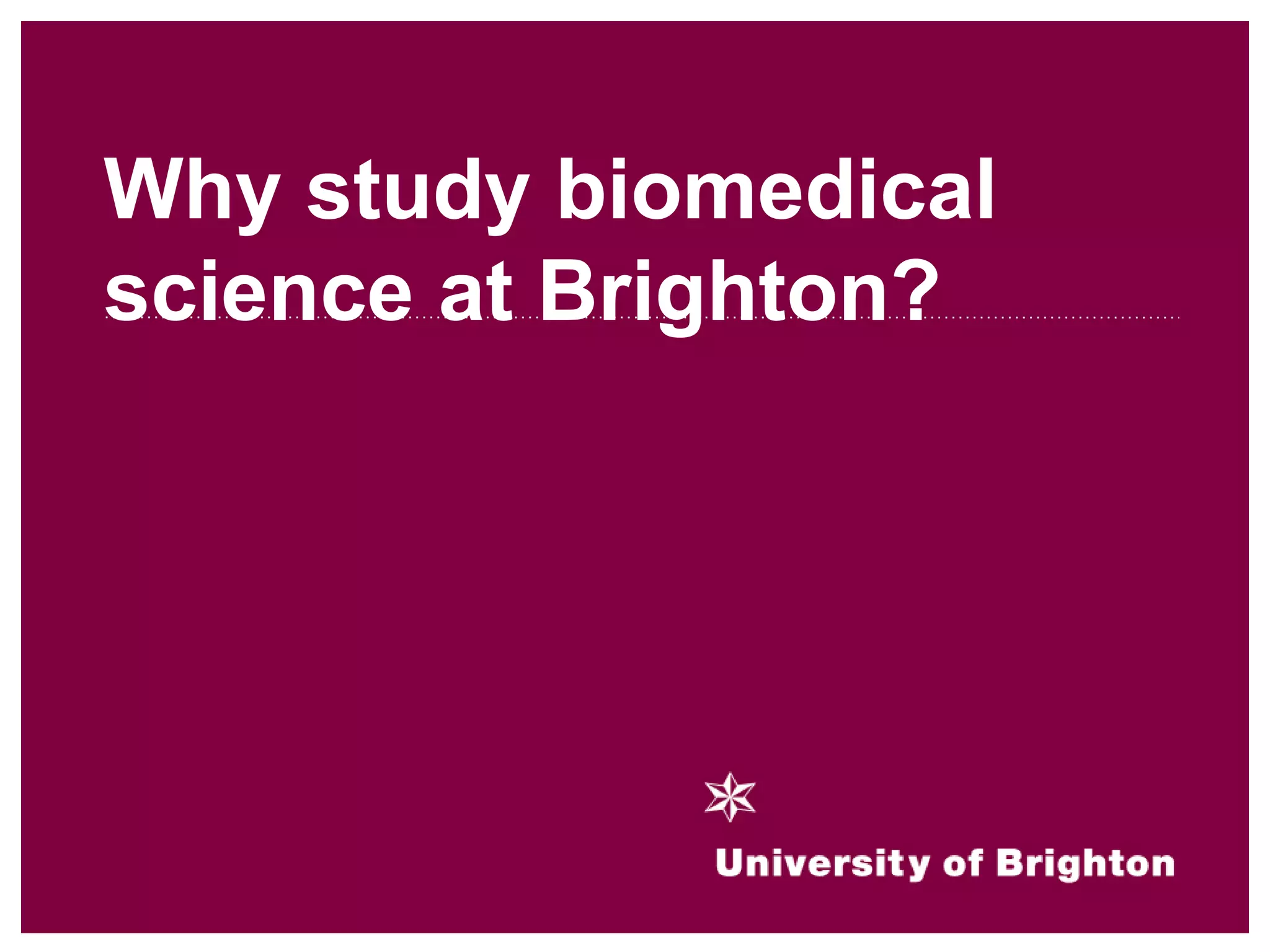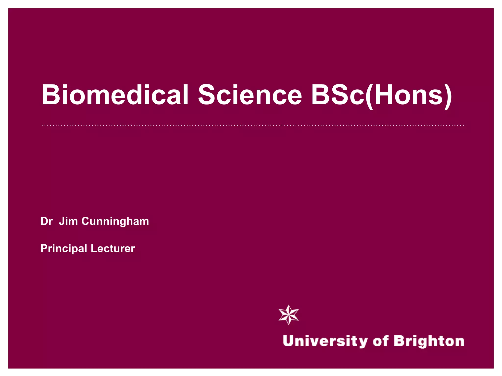 This document provides information about the Biomedical Science BSc(Hons) degree program at the University of Brighton. It outlines the key aspects of the program including its accreditation, career focus, course structure over three years, research-informed teaching, support systems, facilities, and typical entry requirements. The degree prepares students for a diverse range of careers in bioscience research, laboratory healthcare sciences, and professional roles allied to medicine.