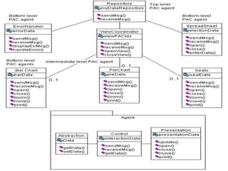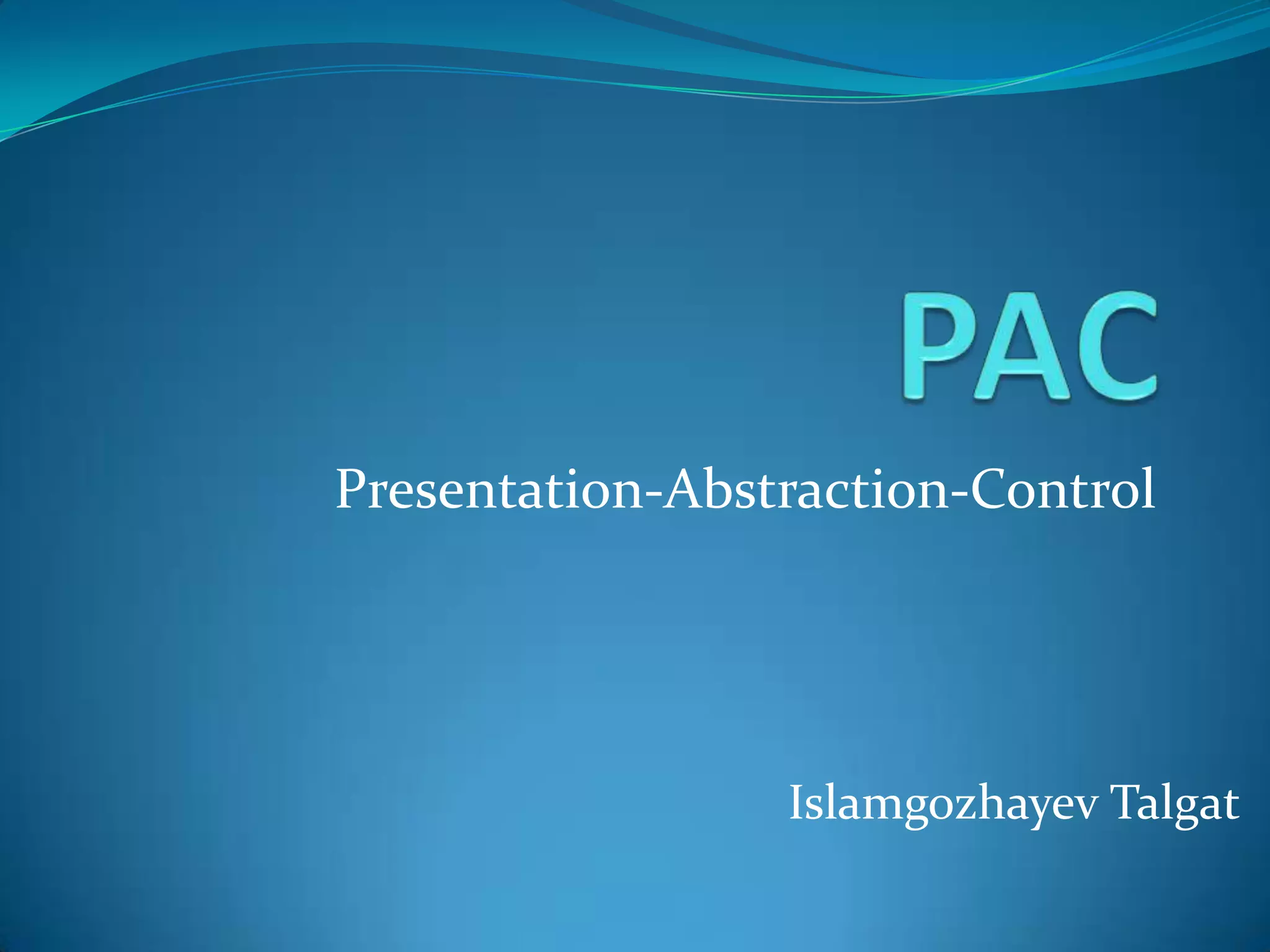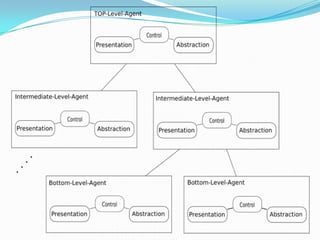 The Presentation-Abstraction-Control (PAC) pattern structures interactive software systems as a hierarchy of cooperating agents. Each agent has three components: presentation for the user interface, abstraction for the data model and functionality, and control for communication. This separates human and functional concerns and supports modularity, extensibility, and distribution of the system. Examples of PAC include air traffic control systems and content management systems like Drupal.