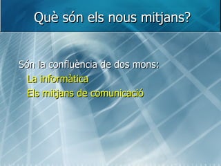 Què són elsnous mitjans? Són la confluència de dos mons: La informàtica Els mitjans de comunicació