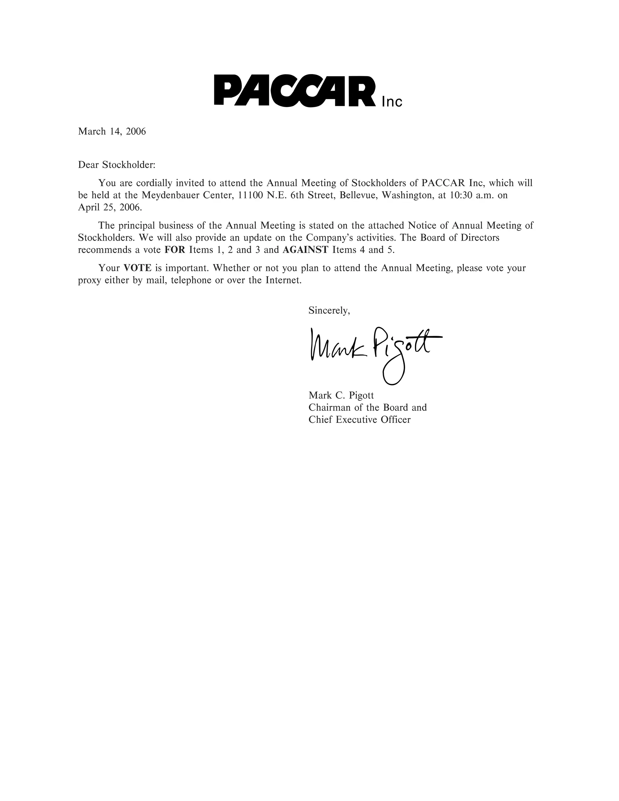 This document is the proxy statement for PACCAR Inc.'s annual stockholder meeting to be held on April 25, 2006. It provides details on items to be voted on, including the election of three Class II directors. It also provides summaries of executive compensation, stock ownership by directors and executives, and recommendations by the board on how to vote. Stockholders are invited to attend the meeting and are encouraged to vote by proxy in advance by mail, phone or online.