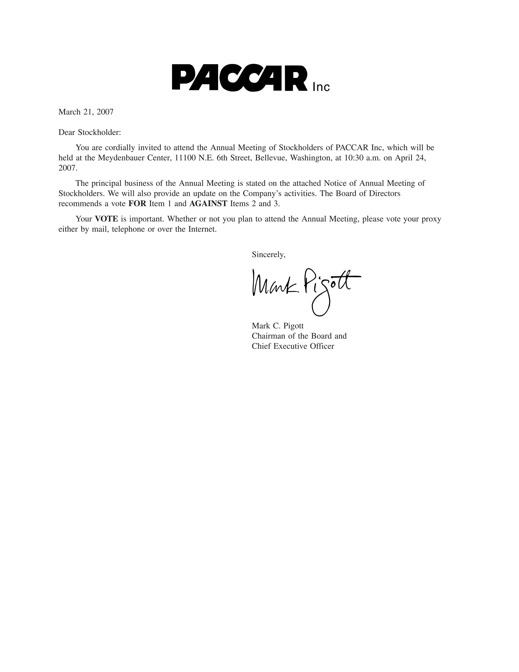 This document is a proxy statement from PACCAR Inc. inviting shareholders to attend the company's Annual Meeting on April 24, 2007. The principal business of the meeting is to elect three directors to serve three-year terms. Shareholders will also vote on two stockholder proposals regarding the company's shareholder rights plan and director vote threshold. Shareholders are encouraged to vote by proxy in advance of the meeting either by mail, phone or online.