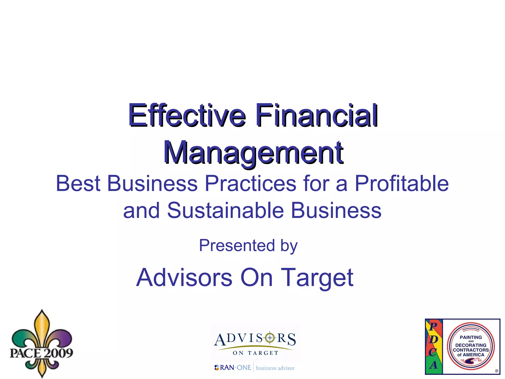 The document outlines effective financial management practices crucial for achieving a profitable and sustainable business, focusing on three key financial indicators: profit margins, cash flow, and return on investment (ROI). It provides strategies for improving profitability, emphasizes the importance of budgeting, and details best practices for monitoring key financial metrics. The guide is aimed at helping businesses make informed decisions to enhance operations and financial health.