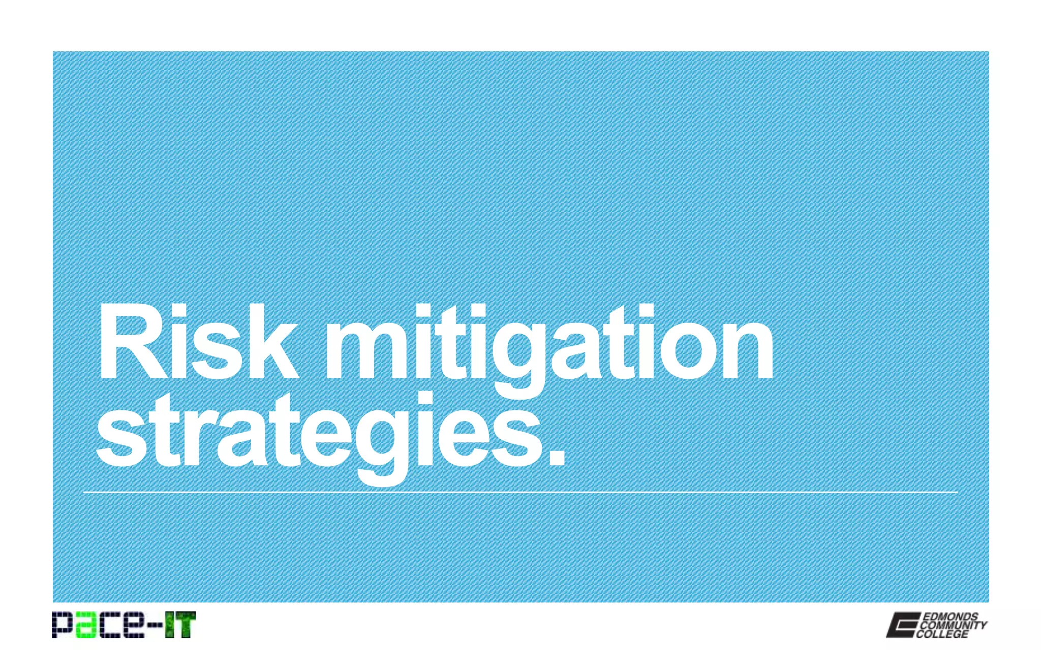 The document discusses various risk mitigation strategies. Any change to a system represents a risk, so change management is implemented to evaluate changes and their effects on the system. Periodic reviews of user rights and permissions can also mitigate risk. Security audits should be performed regularly to reduce risks to systems and data. Effective incident management can limit damage from risk events and help prevent recurrences. Properly enforcing policies and procedures can prevent data loss or theft. Data loss prevention systems can further help prevent sensitive data from being lost or stolen.