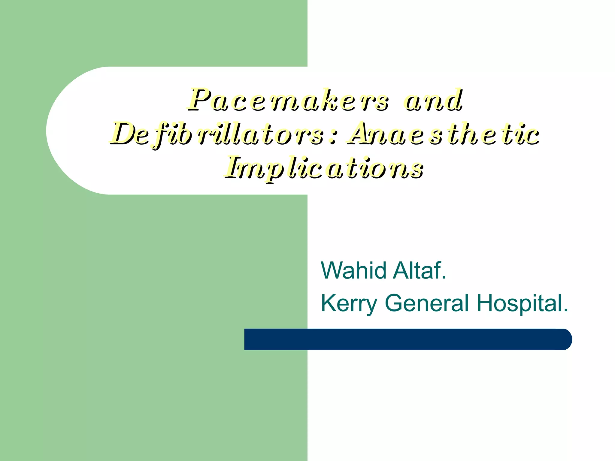 This document provides an overview of pacemakers and defibrillators, including their history, types, indications for use, important terminology, factors to consider from an anesthesia perspective, preoperative evaluation, intraoperative management, and specific perioperative considerations. It discusses the development of pacemakers from early external versions to modern implantable devices, and covers defibrillator components and codes.
