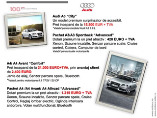 Audi A3 “City”Unmodel premium surprinzator de accesibil.Pretincepand de la 15.500 EUR + TVA*Valabilpentrumodelul Audi A3 1.6 LPachet A3/A3 Sportback “Advanced”Dotari premium la un pretatractiv : 420 EURO + TVAXenon, Scauneincalzite, Senzorparcare spate, Cruise control, Cotiera, Computer de bordValabilpentrutoatemotorizarileA4/ A4 Avant “Confort”Pretincepand de la 21.000 EURO+TVA, prinavantaj client de 2.400 EUROJante de aliaj, Senzorparcare spate, Bluetooth*Valabilpentru motorizarea1.8 TFSI/ 120 CP PachetA4 /A4 Avant/ A4 Allroad “Advanced”Dotari premium la un pretatractiv : 1.218 EURO + TVAXenon, Scauneincalzite, Senzorparcare spate, Cruise Control, Reglajlombar electric, Oglindainterioaraantiorbire, Volan multifunctional, Bluetoothwww.midocar.rowww.midocaracter.ro