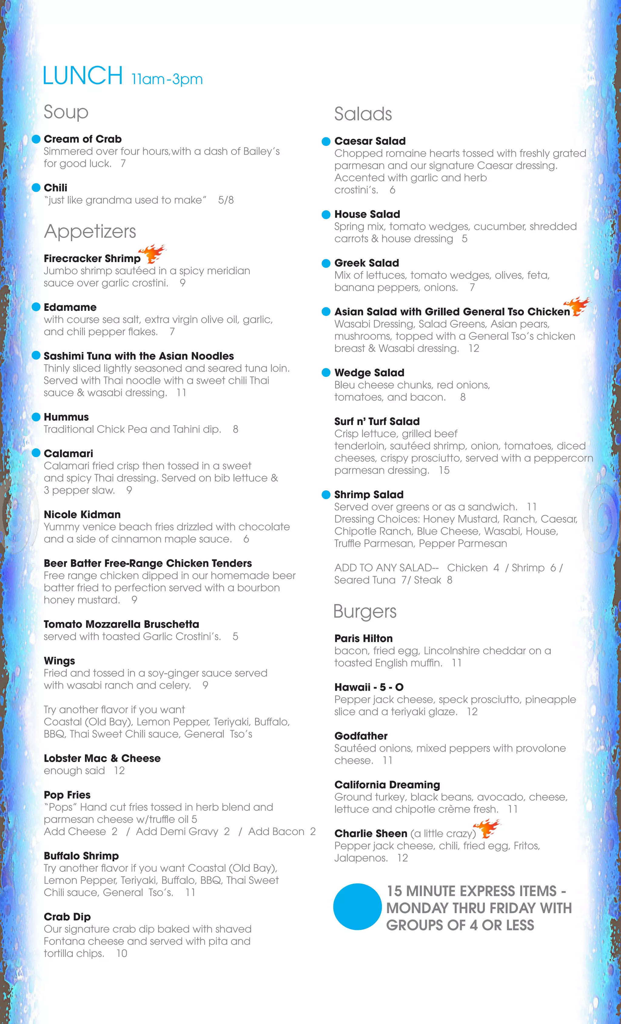 The document is a menu detailing various lunch offerings, including soups, salads, appetizers, burgers, sandwiches, and entrees with descriptions and prices for each item. Highlights include dishes like Caesar salad, firecracker shrimp, crab cakes, and various unique wraps and sandwiches. The menu suggests a diverse range of flavors and ingredients, catering to different tastes and dietary preferences.