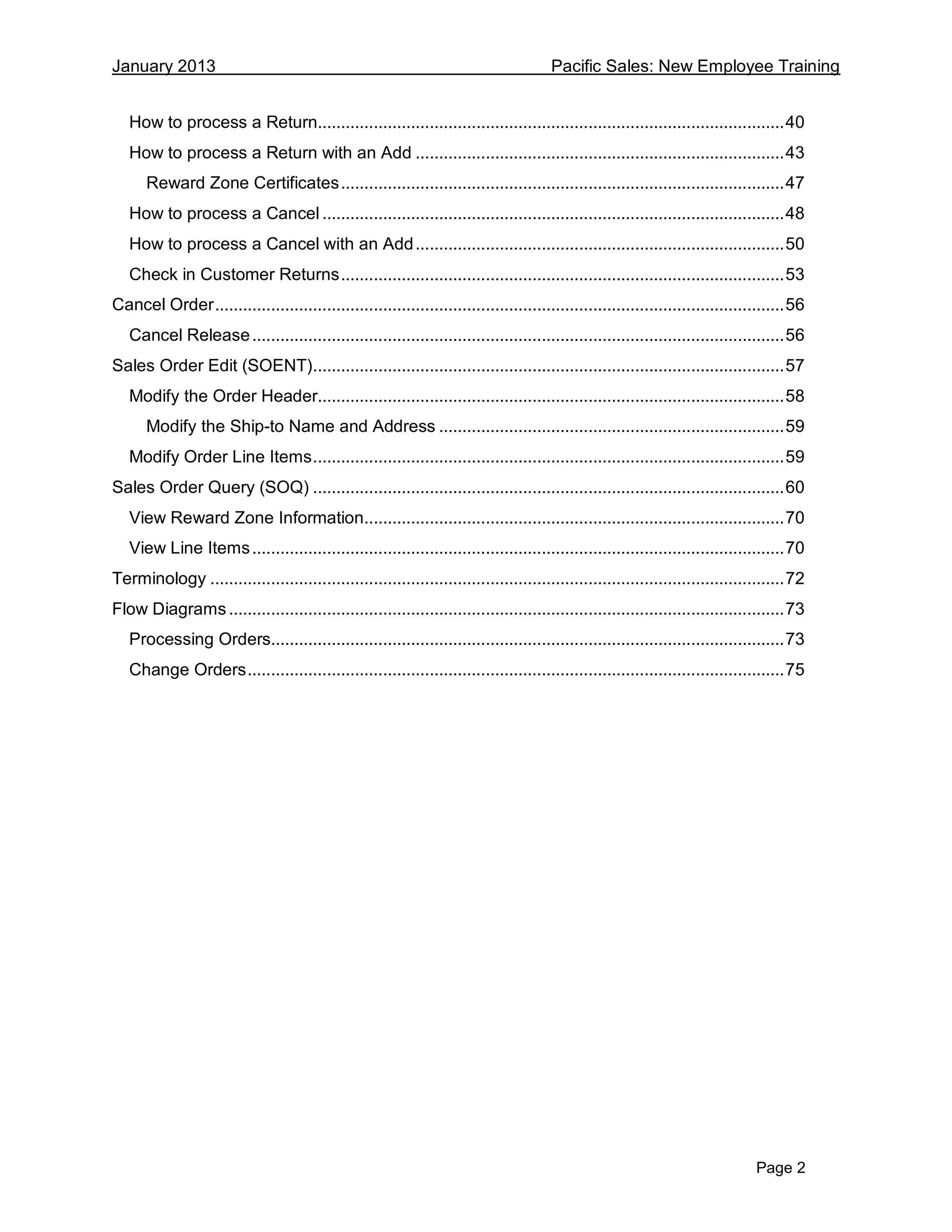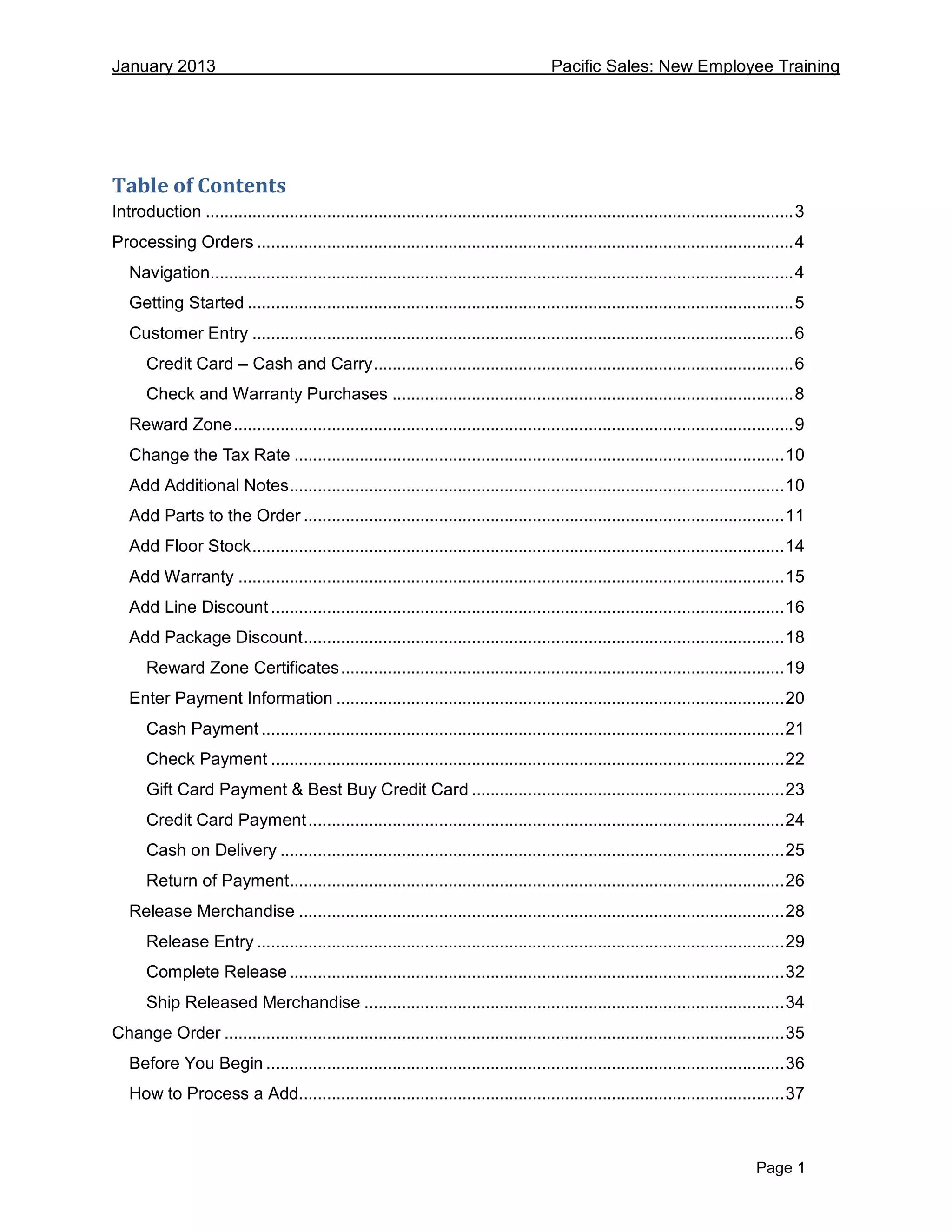 This document provides instructions for Pacific Sales employees on processing sales orders in their system. It covers entering customer and order information, adding parts and accessories to the order, applying discounts, recording payment methods, and completing the order entry process. The steps provided include finding the customer, adding new customers, entering shipping and payment details, looking up reward accounts, and processing different order types such as cash, check, credit card, or warranty purchases.