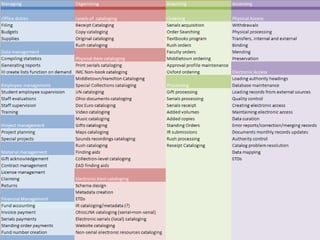 The document discusses changes in technical services staffing and workflows at libraries. It recommends eliminating low-value tasks like manual transcription, item-by-item decisions, redundant systems, and procedures that introduce error. Some specific suggestions are to stop routing print journals if they are available online, automate repetitive tasks using macros and scripts, and review workflows to identify those that are no longer needed. The talk encourages focusing resources on critical tasks and leveraging automation through batch processing and third-party applications.
