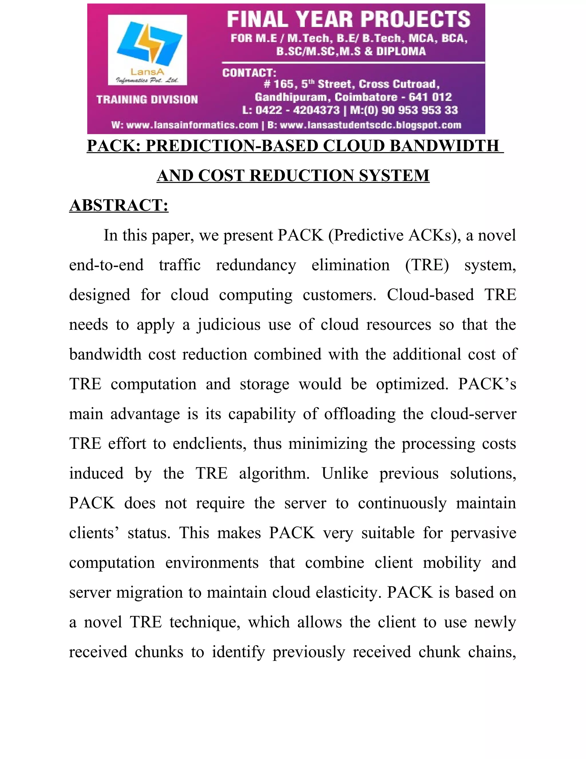The document presents PACK (Prediction-based ACKs), a novel end-to-end traffic redundancy elimination system designed for cloud computing. It aims to reduce bandwidth costs by offloading the processing to end clients, minimizing server costs. Unlike previous sender-based solutions, PACK is receiver-based and does not require the server to continuously maintain client status. The receiver sends predictions to the server, which responds with ACKs if redundancy is detected instead of sending the data. This makes PACK suitable for mobile and elastic cloud environments. Experiments show the approach can reach speeds over 3Gb/s, faster than traditional methods.
