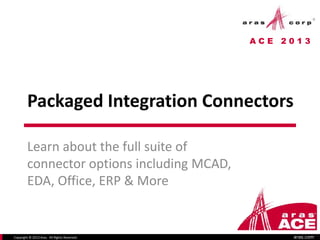 The document discusses various types of packaged integration connectors available for connecting Aras Innovator to external systems such as CAD software, PDM/ALM systems, Microsoft Office applications, and ERP systems. It provides information on direct connectors to CAD systems as well as PDM connectors. It also describes how the different connector types work to integrate data and processes with Aras Innovator.