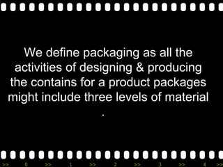 Packaging has three levels: primary, secondary, and shipping. The functions of packaging are protection from damage and contamination, convenience for customers and retailers, and cost effectiveness. Factors contributing to more marketing-focused packaging include self-service shopping, consumer affluence, company/brand image, and opportunities for innovation with new materials and features. Developing effective packaging requires decisions that achieve objectives like identifying the brand, providing information, facilitating transport and storage, and aiding consumption.