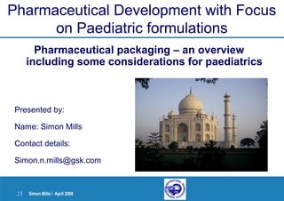 This document provides an overview of a presentation on pharmaceutical packaging and development with a focus on pediatric formulations. It discusses choosing appropriate primary packaging, regulatory considerations, extractables and leachables testing, and packaging development processes. Specific topics covered include blister packs, bottles, closures, barrier properties of materials, desiccants, oxygen and water vapor transmission rates, and first intent guidelines.