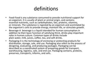 The document discusses packaging for the food and beverage industry. It defines food, beverages, and packaging. It then covers types of non-alcoholic beverages like carbonated beverages, fruit beverages, tea, and coffee. It discusses their packaging requirements to prevent deterioration like moisture, oxygen, and microbial growth. It also covers alcoholic beverages like beer, wine, and distilled spirits and their packaging in bottles or cans to prevent flavor loss and maintain quality. Overall, it examines the packaging needs of various food and drinks to protect quality during storage and distribution.