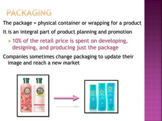 Packaging and labeling serve several important purposes. Packaging protects products during shipping and storage, prevents tampering, and aids in product promotion and sales. Labeling provides key information to customers about product contents and use. Effective labels feature graphics and fonts that attract attention, communicate the brand, and describe the product through colors, shapes, and clearly presented contact and contents information. Together, packaging and labeling are an essential part of marketing strategy and ensuring safe and appropriate product use.