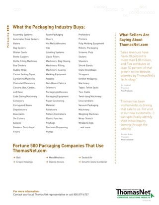The packaging industry utilizes many materials like glass, plastic, paper, and corrugated board. Packaging companies source large quantities of the materials, machinery, and services they need on ThomasNet.com. These include items like assembly systems, automated case sealers, balers, bag sealers, bottle cappers, and more. Major packaging companies like Ball, Crown Holdings, MeadWestvaco, Owens-Illinois, Sealed Air, and Smurfit-Stone Container use ThomasNet.com to find suppliers.