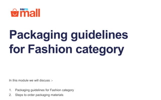 The document outlines packaging guidelines for the fashion category, emphasizing the importance of proper packaging to ensure product safety and customer satisfaction. It details the types of packaging materials required, the packing process, and the potential impacts of incorrect packaging. The guidelines also include specific instructions on how to properly attach packing slips and invoices to shipments.