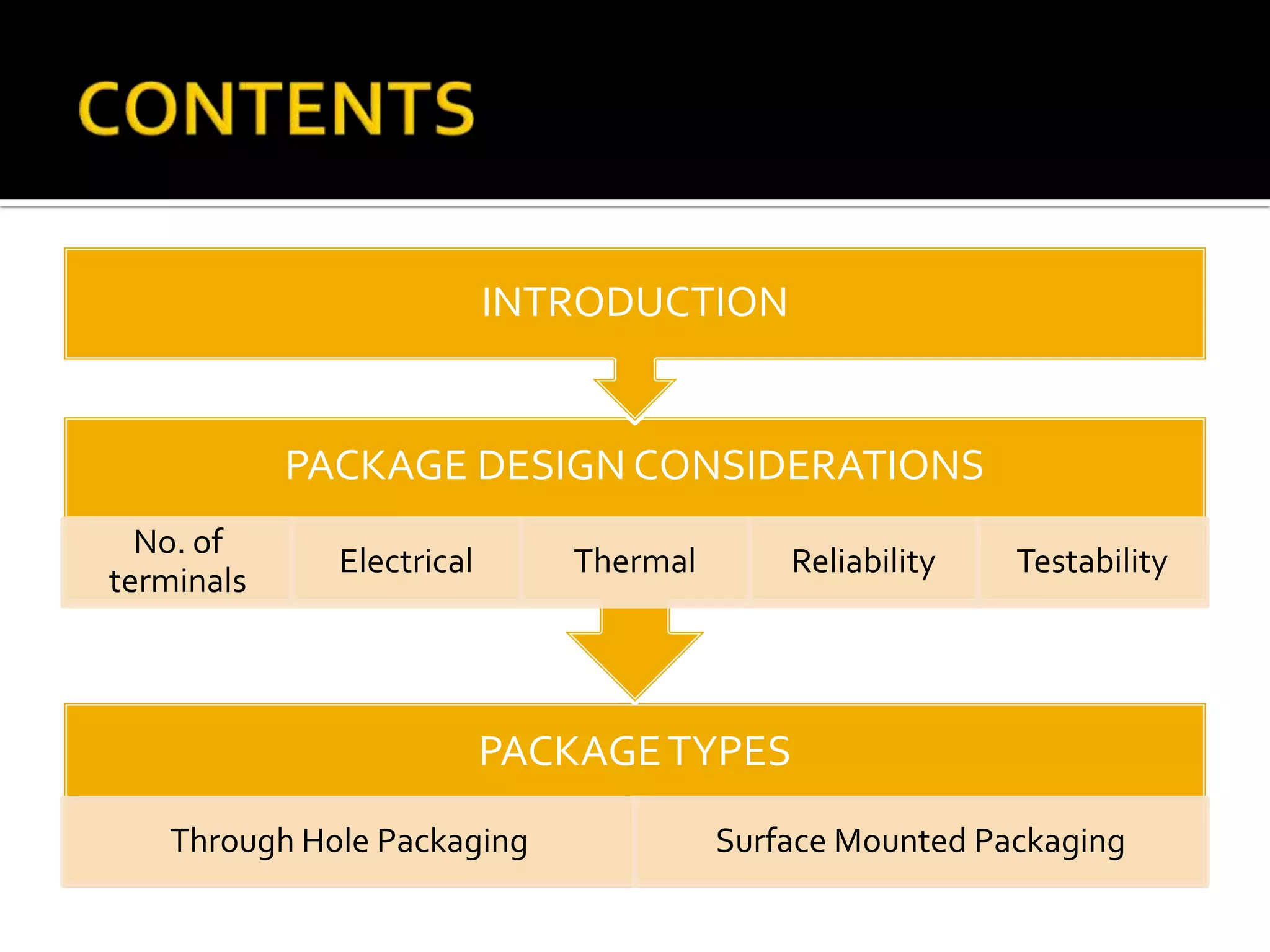 This document discusses package design considerations and types of semiconductor packages. It covers key factors in package design like the number of terminals, electrical, thermal, and reliability requirements. The main package types discussed are through-hole packages like DIP and QFP, and surface mount packages like SOP, PLCC, and LCCC. Through-hole packages use precision holes drilled through the board while surface mount packages solder directly to the board surface.