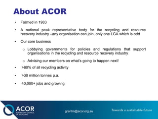 ACOR is a national peak representative body for the recycling and resource recovery industry in Australia. It lobbies governments for policies that support recycling organizations and advises its members. Key barriers to increasing packaging recycling include packaging design, lack of investment in infrastructure, and the fact that some packaging is not recyclable. Current trends in packaging design focus on life cycle assessments, while recycling trends involve new technologies. Regulatory trends are moving towards internalizing externalities and requiring design for recovery of packaging materials. International trends show other countries increasingly restricting non-recyclable packaging and imports of contaminated plastics in an effort to transition to a circular economy model.