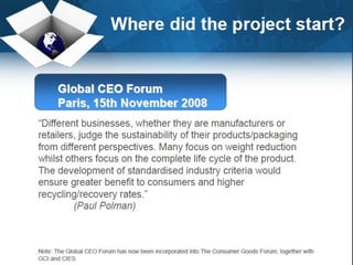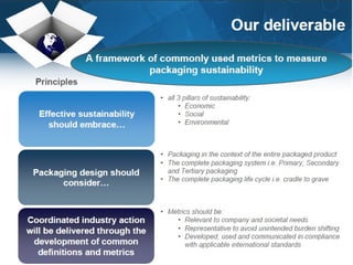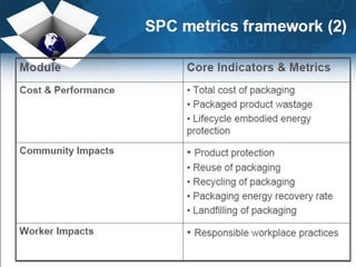 The document discusses shelf ready packaging, which refers to products packaged in a way that is easy to identify, open, stock on shelves, and dispose of, in order to optimize shelf replenishment and visibility. It notes that while shelf ready packaging can improve efficiency, its implementation should be evaluated on a case-by-case basis rather than adopted systematically. The document also outlines principles and requirements for packaging from both business and environmental sustainability perspectives.