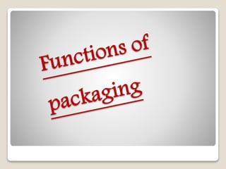 Packaging serves several important functions. It primarily refers to the container or wrapper for a product, and is a key part of marketing. There are three main types of packaging: primary for the immediate container, secondary for additional protection layers, and transportation for storing and moving multiple products. Packaging protects products, promotes them, attracts customers, allows for easy identification and differentiation between products, and provides convenience. It prevents spoilage, breakage, damage and adulteration while allowing the product to be promoted and sold.