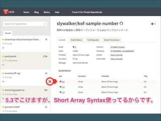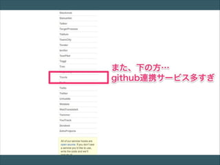 Travis-CI • オープンソースコミュニティの為の、 ホスティング型継続的 インテグレーションサービス • GitHubと連携し多数の言語を スムーズにサポート •