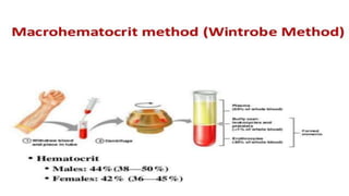 This document discusses packed cell volume (PCV), also known as hematocrit. It defines PCV as the volume of erythrocytes (red blood cells) as a percentage of total blood volume. The document describes how PCV is determined through centrifugation and separation of blood components. It notes several clinical implications of PCV levels, such as increases seen in infants and high altitudes and decreases in pregnancy. The key information provided is an overview of PCV/hematocrit testing and its importance in clinical evaluation.