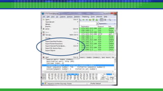 The document provides an overview of packet analysis, detailing its uses, tools, and techniques for monitoring and troubleshooting network traffic. It covers specific aspects such as the OSI model, TCP/IP protocol suite, and various packet analyzers like Wireshark, while discussing normal and abnormal traffic patterns, including DNS, FTP, and ICMP. Additionally, it explains methods for detecting network intrusion and issues such as latency and uses tools like Nmap for network scanning.
